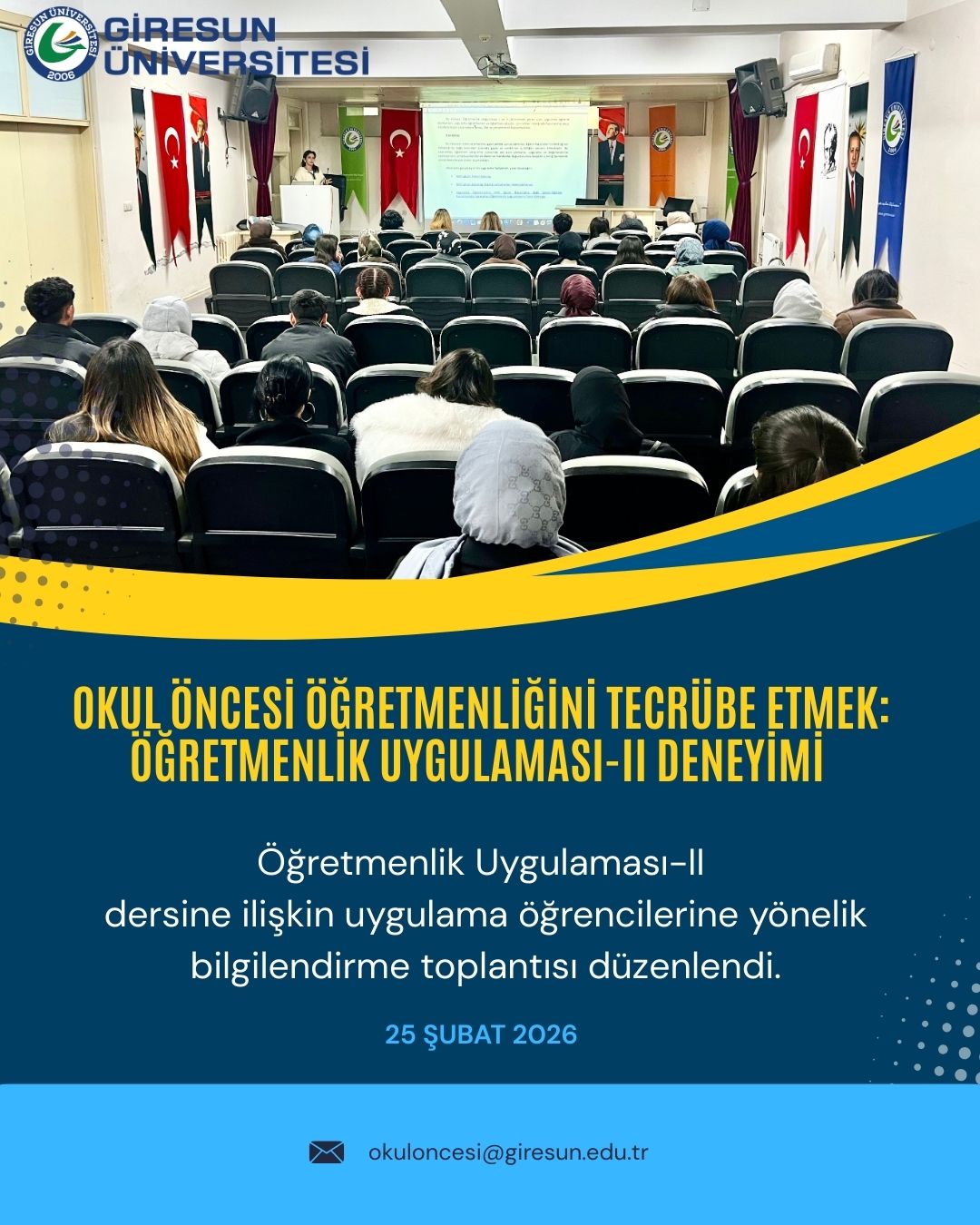 Ana Bilim Dalımız, 2025-2026 akademik yılı bahar yarıyılına ilişkin “Öğretmenlik Uygulaması II” dersi kapsamında, son sınıf öğrencilerine yönelik bilgilendirme toplantısı gerçekleştirdi.