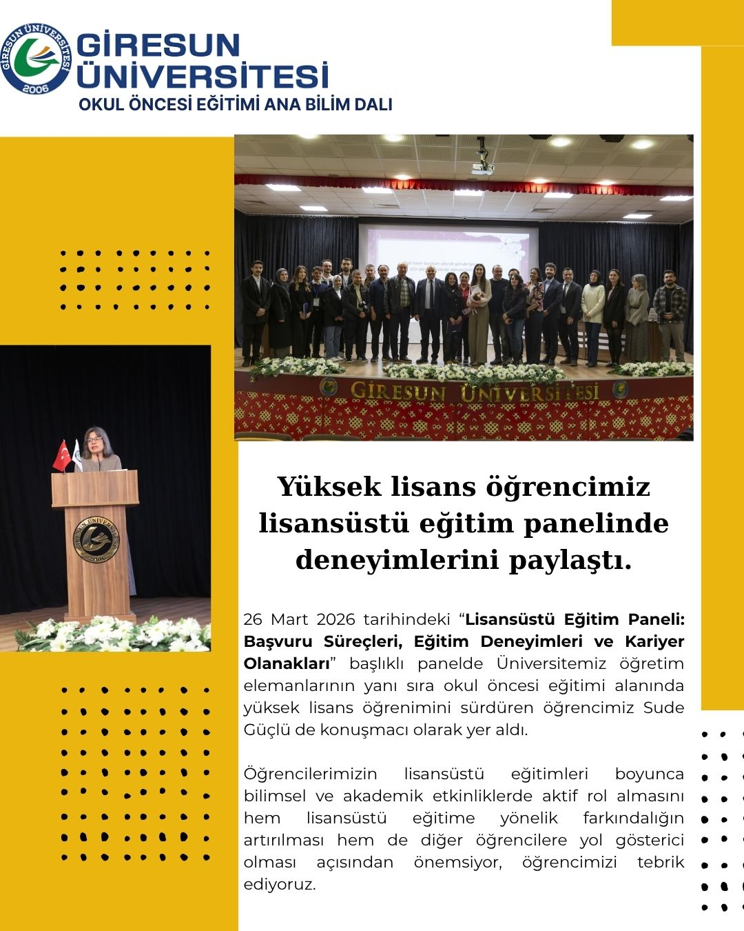 Üniversitemizin Genç Fikirler ve İdealler Topluluğu tarafından organize edilen ve 26 Mart 2026 tarihinde Şehit Ömer Halisdemir Konferans Salonu’nda lisansüstü başvuru süreçleri, eğitim deneyimleri ve kariyer olanaklarına ilişkin "Lisansüstü Eğitim Paneli: Başvuru Süreçleri, Eğitim Deneyimleri ve Kariyer Olanakları” başlıklı bir panel gerçekleştirildi. Panelde, Üniversitemiz öğretim elemanlarının yanı sıra okul öncesi eğitimi alanında yüksek lisans öğrenimini sürdüren öğrencimiz Sude GÜÇLÜ de konuşmacı olarak yer aldı ve deneyimlerini katılımcılarla paylaştı.