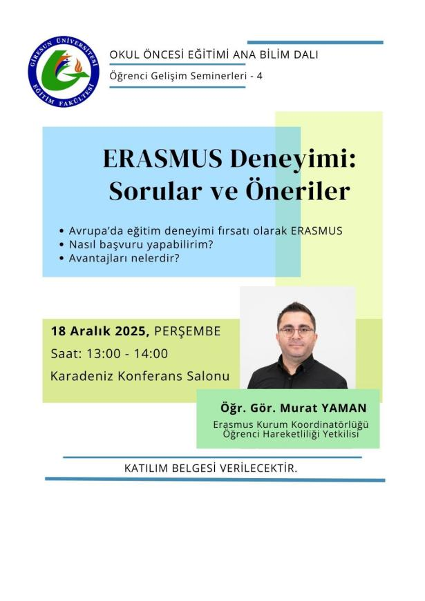 Ana Bilim Dalımızın düzenlediği öğrenci gelişim seminerleri kapsamında Üniversitemiz Erasmus Kurum Koordinatörlüğü Öğrenci Hareketliliği Yetkilisi Öğr. Gör. Murat YAMAN öğrencilerimizle bir araya geldi.